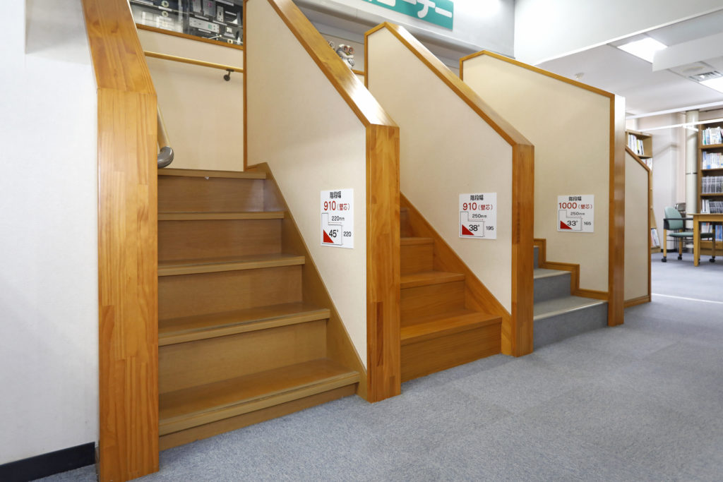 住宅を新築、リフォームする際の参考として、階段の幅や踏面、蹴上寸法の寸法の異なる4種類の階段を体験できます。
