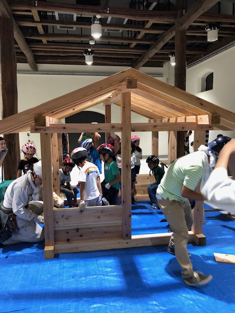 「まなぶじかん」では、釘を使わない「木組み」という技でつくる家のことやその材料となる群馬県産の木材のこと、「上棟式」というお祝いについてなどを学び、「つくるじかん」ではみんなで力を合わせて「木組み」の家を組み立てました。完成した「木組み」の家の一番上から講師の先生たちが、お祝いのお菓子をまいてくれました。