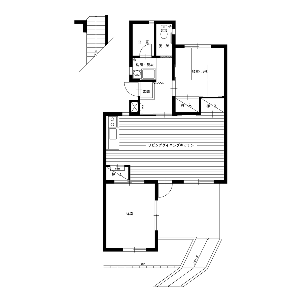 - 詳細(車イス)4.5/洋6/LDK、水洗トイレ、浴槽釜設置